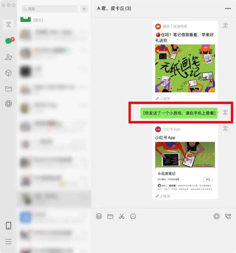 在之前的测试中,我们发现微信 for Mac 暂不支持小游戏的分享,到了微信 for Mac 3.0.0 内测版,小游戏依然无法在桌面端打开。