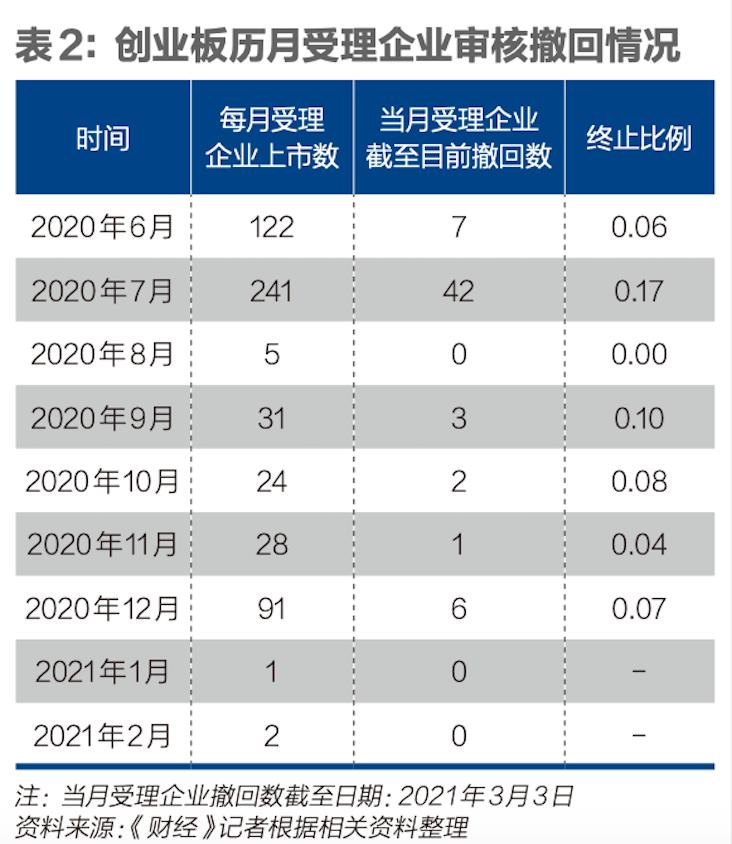 截至3月3日,创业板7月受理的241家企业中,有42家已终止审核,占创业板总撤回比例较高。