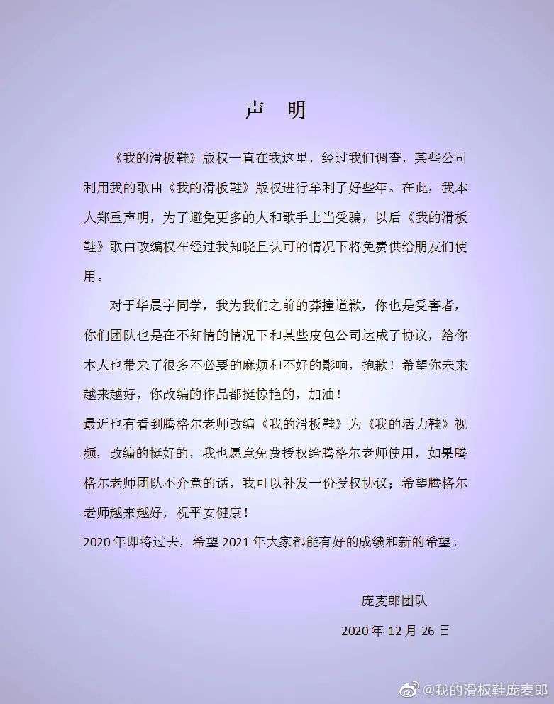 直到一年后,庞麦郎才通过微博向华晨宇发出了道歉声明,称是有第三方在他不知情的情况下将歌曲的版权卖给了华晨宇进行商用。