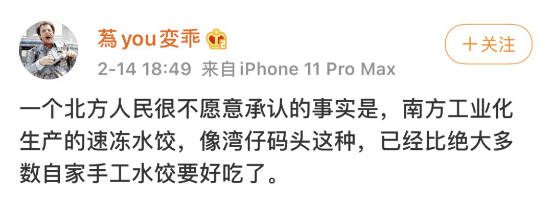 暂且不说他的结是否正确,这个表述完全可以说成「其实现在工业化生产的速冻水饺,已经比绝大多数自家手工水饺好吃了」,非要扯上南北地域问题,唐老板也是引得一手好战。