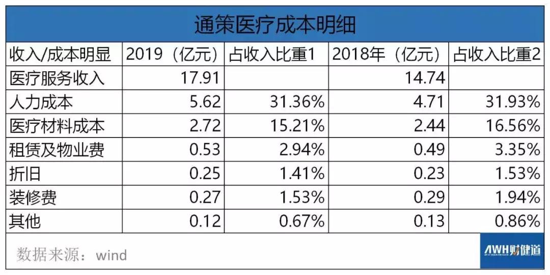 以主营口腔服务的上市公司通策医疗为例,2018年、2019年成本明细中,占收入比重最大的是人力成本,占比达到31%以上,其次才是15%-17%的材料成本。