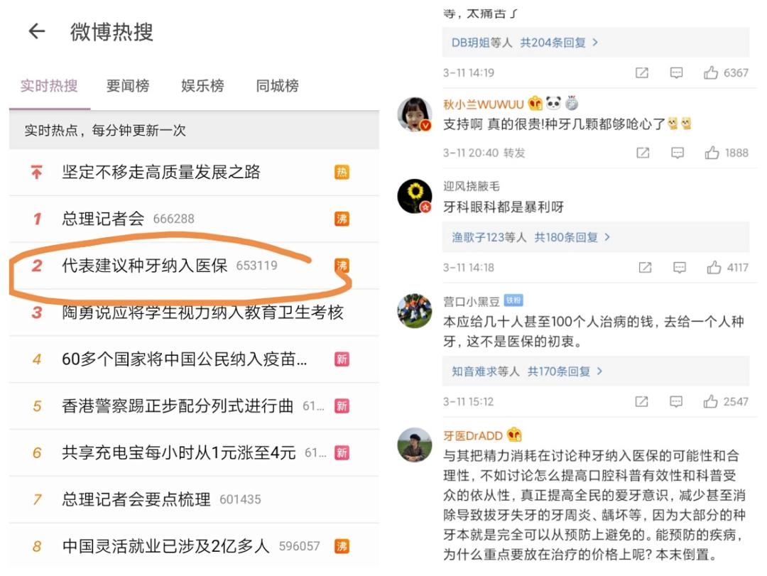 3月11日,一则“代表建议种牙纳入医保”的话题冲上微博热搜,热度仅次于总理记者会,位列第二。全国人大代表、肥东县总工会兼职副主席李小莉表示:群众对“看牙贵、牙科暴利”的呼声很高。一个县级以下医院,口腔治疗门诊平均每天接待患者大约30位,平均一颗种植牙治疗费用大约在6000-20000元不等。如果种全口牙,相当于在县城买套房。