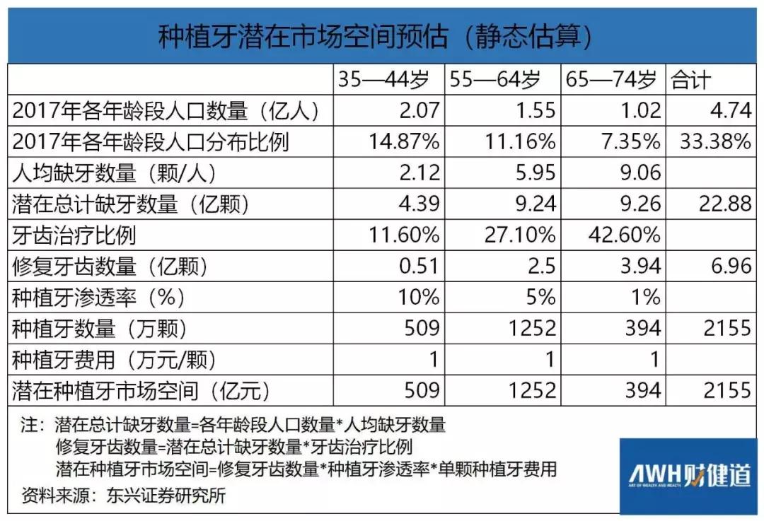 其次,种植牙、正畸患者群体基数大,医保资金不足以应付如此巨大的报销金额。从需求端来看,根据东兴证券测算,2017年我国潜在缺牙数总计达 22.88 亿颗,乘以选择进行牙齿治疗的比率、种植牙的渗透率,种植牙数量可能达到2155万颗,以目前一颗种植牙1万元的价格计算,潜在种植牙市场空间达到 2155 亿元。