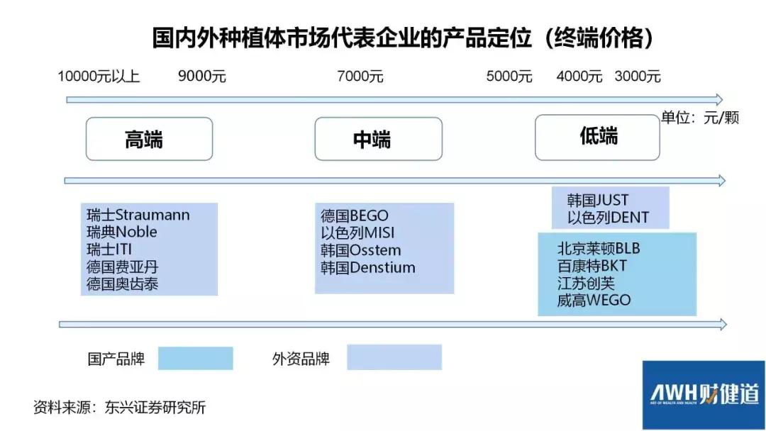 在中国上游种植体的市场中,进口品牌占比约90%以上,国产品牌为10%左右。目前国内共13个国产种植体品牌获批上市,主要集中于低端市场;医疗机构自主研发的种植体,以自用为主。