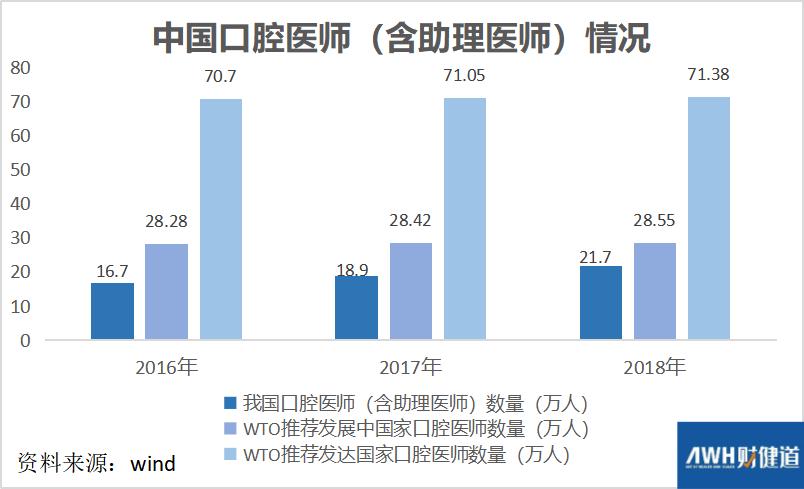 目前,我国仍然面临牙科医生稀缺的现状,在服务供给上存在不足。2016年美国每百万人拥有口腔科医师数量达到了1600人,而中国每百万人拥有口腔科医师数量仅100人,相差16倍。按照WTO公认的发展中国家1:5000的口腔医生与人口比例,国内尚且存在6.85万位口腔医生的缺口。
