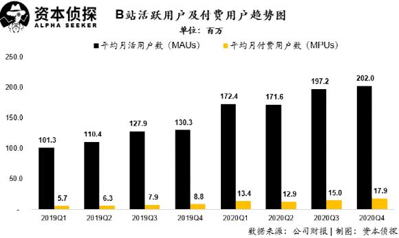 截止2020年四季度,B站月平均活跃用户数(MAUs)已经超过2亿,达到2.02亿,同比增长55%;其中月平均付费用户数(MPUs)也增加至1790万人, 同比大增103%。