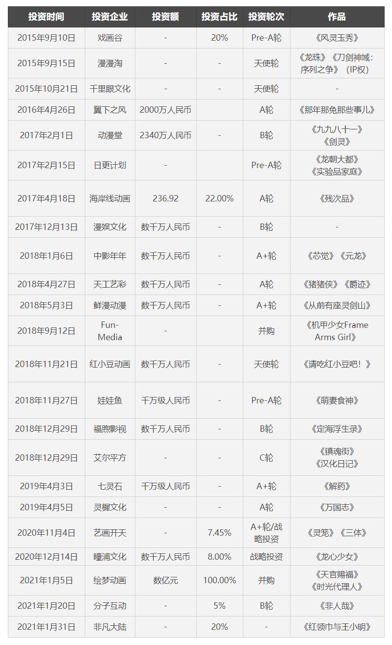 B站投资的动画公司情况(图片来源:全天候科技根据公开信息整理)