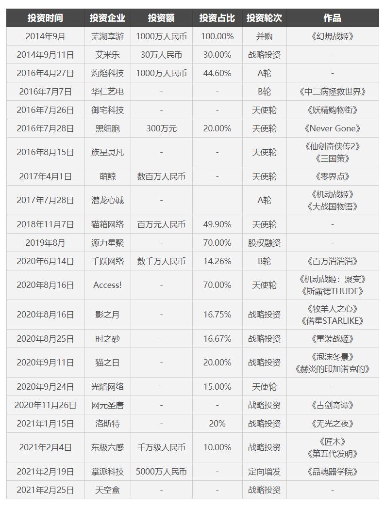 B站投资的投游戏公司(图片来源:全天候科技根据公开信息整理)