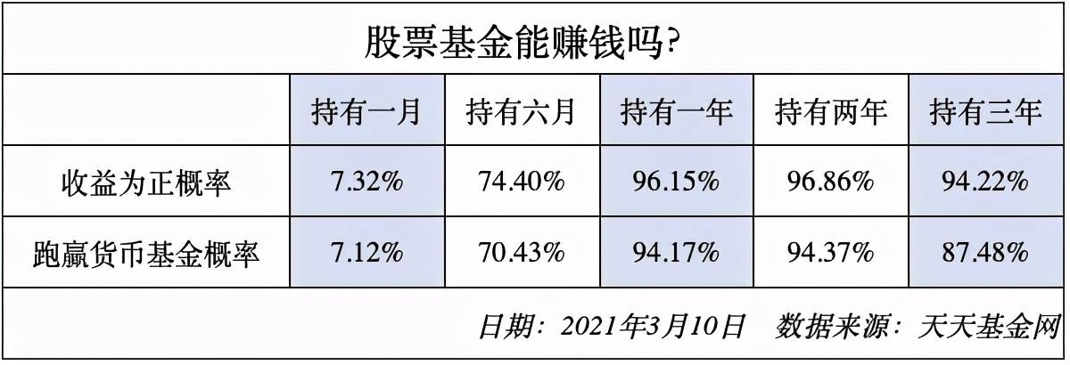 后来我看过我一个数据分析图,就是大数据分析持有一到三年的基金,赚钱的概率有多大,以及跑赢货币基金的概率。正是这张图,让我坚定践行“长期主义”。