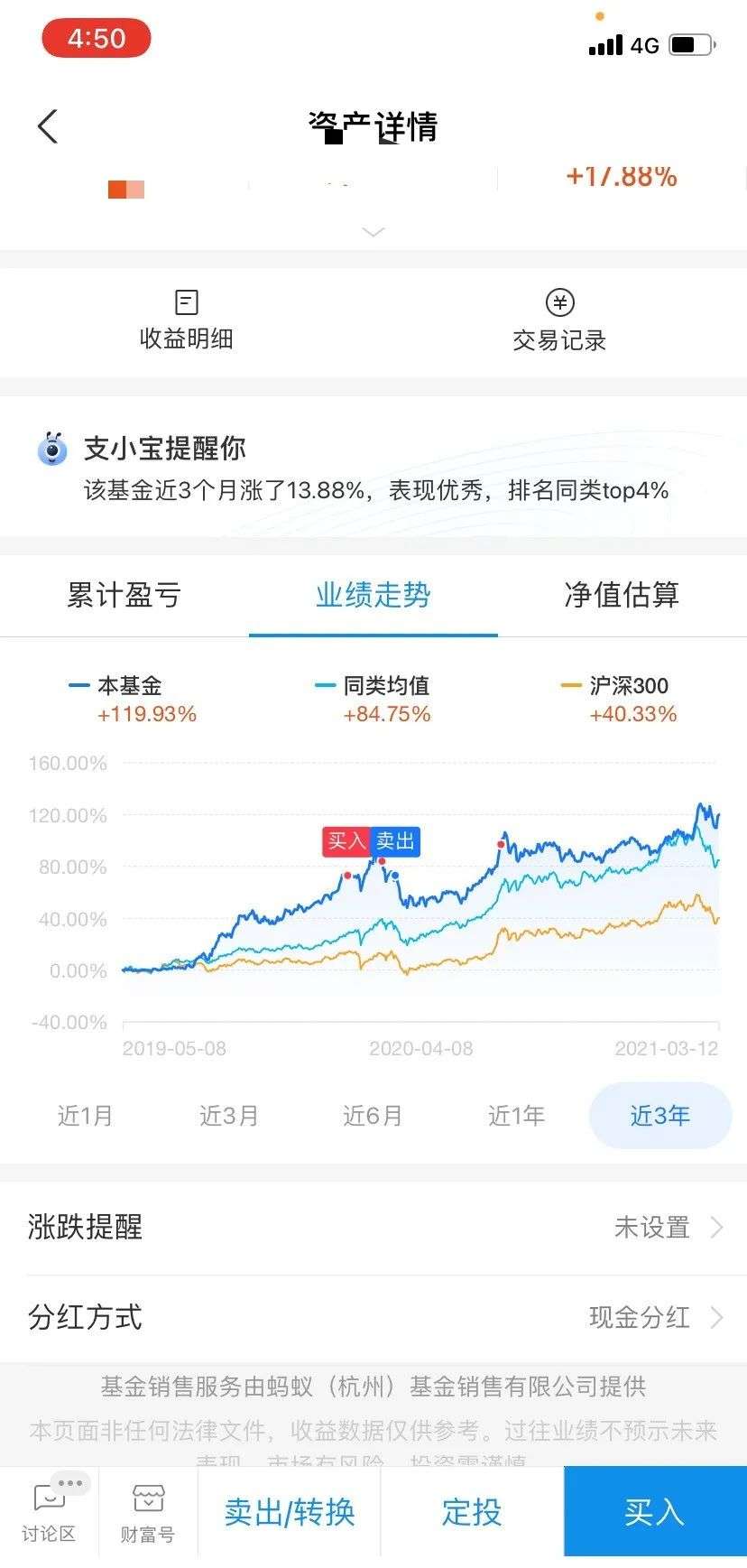 我都好久没看基金了,最近听说跌了才登录看了下。支付宝还提醒我,近三月涨了13.88%,表现优秀,我都想吃顿大餐奖励下自己。