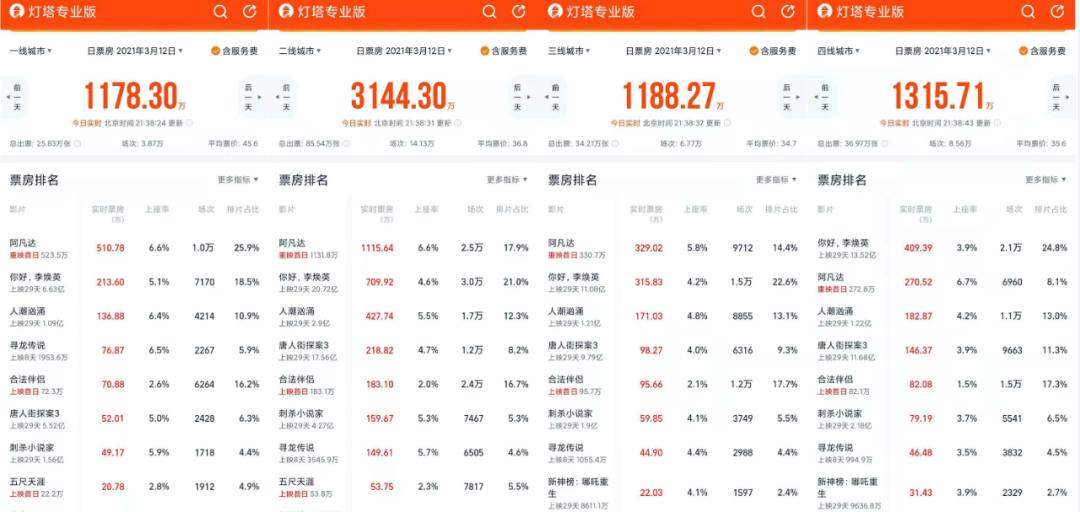 我们从今天大盘不同城市的市场占比也能看出,一二线城市《阿凡达》依旧有较高的票房号召力。但是到了三四线城市,《阿凡达》与《你好,李焕英》的差距不断减少,大多数四线城市因为没有收到拷贝,《你好,李焕英》的票房要比《阿凡达》高很多。甚至很多南方的三四线城市,《阿凡达》甚至一场排片都没有。