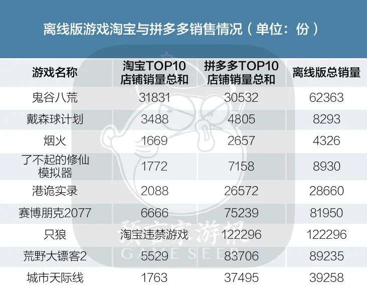 根据预言家游报的统计,淘宝和拼多多售卖《鬼谷八荒》离线版前十名的店铺,总共售出了62363份游戏,给《鬼谷八荒》造成了424万元的损失。