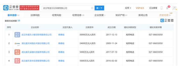 另外,陪玩专区指向了一家名为带带的游戏交友平台,这个游戏交友平台隶属于武汉苇渡文化传媒有限公司。企查查上搜索苇渡文化,发现它的联系电话与一众盛天网络旗下公司的联系电话是一致的。
