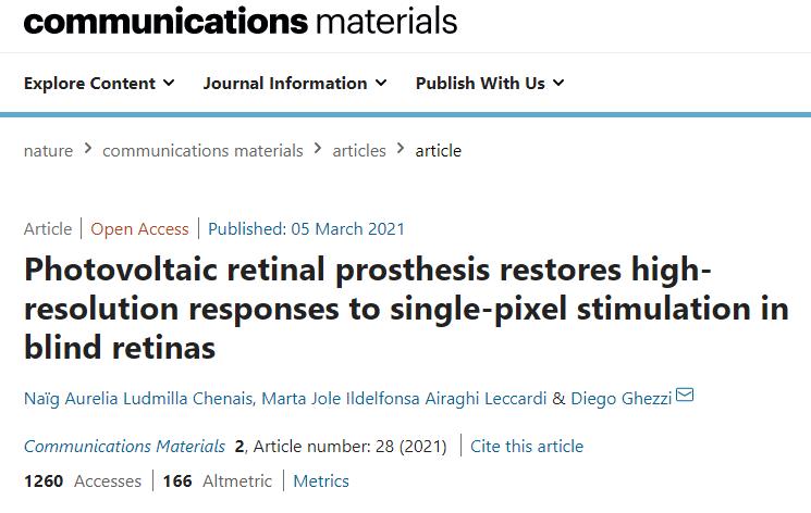 相关论文以 “Photovoltaic retinal prosthesis restores high-resolution responses to single-pixel stimulation in blind retinas” 为题,发表在科学期刊《通讯-材料》(Communications Materials)上。