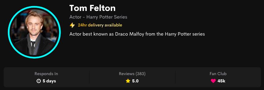 Cameo CEO Steven Galanis 后来总结,「Cameo 上最受欢迎的名人往往『个性真实、强大』」。比如《哈利波特》中「马尔福少爷」的扮演者 Tom Felton(一则 Cameo 价格 599 美元),史诗巨作《权力的游戏》中的许多演员。无论是 NBA 球星蒂姆·哈达威、嘻哈大佬 Snoop Dogg、还是《老友记》中扮演哈克先生的 Larry Hankin……也许真得可以找到你喜欢的那个。