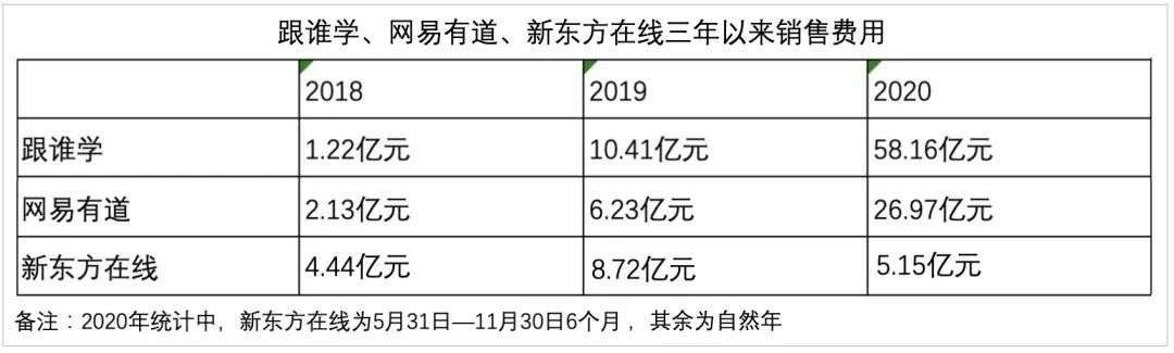 据跟谁学财报,2020年其销售费用达58.16亿元,同比增长458.7%;新东方在线的销售费用是8.72亿元,同比增长76.75%,涨幅已经是几家上市企业中较小的;网易有道为26.97亿元,而在2019年这个费用还只是6.23亿元,相当于涨了4倍之多。