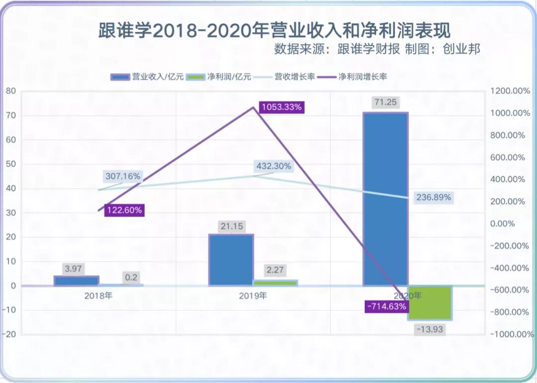在跟谁学交出的2020年成绩单中,总营收71.25亿元,同比增幅236.9%。但与此同时,却亏损了13.93亿元。而在2019年,跟谁学还是盈利的。