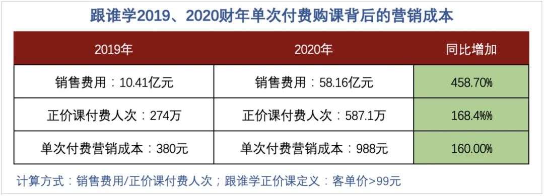 以跟谁学为例,它在2020年实现的正价课付费人次为587.1万,以58亿元的营销费用来计算,相当于它每实现一次付费购课,就要花出988元的营销成本,相比2019年上涨了160%。