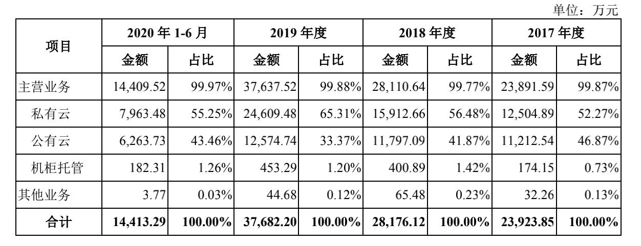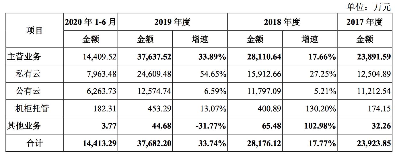 从其收入构成来看,私有云的占比最大,2017年-2019年,其比重从52%逐步上升到了65%,公有云占比次之,到2019年比重为33%,受新冠疫情以及客户季节性采购营销,2020年1-6月,私有云比重有所下降,公有云比重上升到43%。