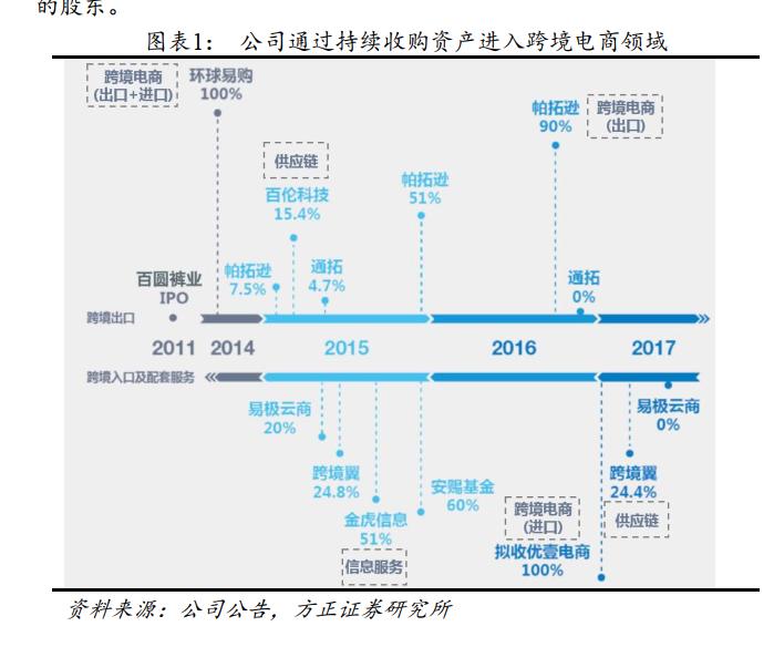 2015年6月,“百圆裤业”正式更名为“跨境通”,成为A股首家上市的跨境电商企业。此后,它不断展现财技,持续收购跨境电商资产。比如,先后投资深圳前海帕拓逊网络技术有限公司、广州百伦贸易有限公司、深圳通拓科技有限公司三家跨境电商企业。到2018年,跨境通还实现了对帕拓逊 100%股份的收购。