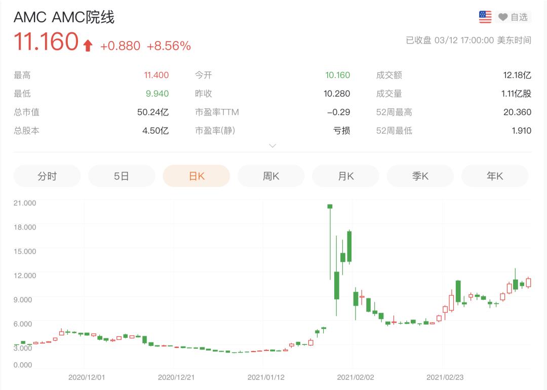 美东时间3月12日,AMC院线的收盘价报11.16美元/股,单日涨幅8.56%,整体依旧保持上涨态势,濒临崩盘的财务状况出现明显转机。