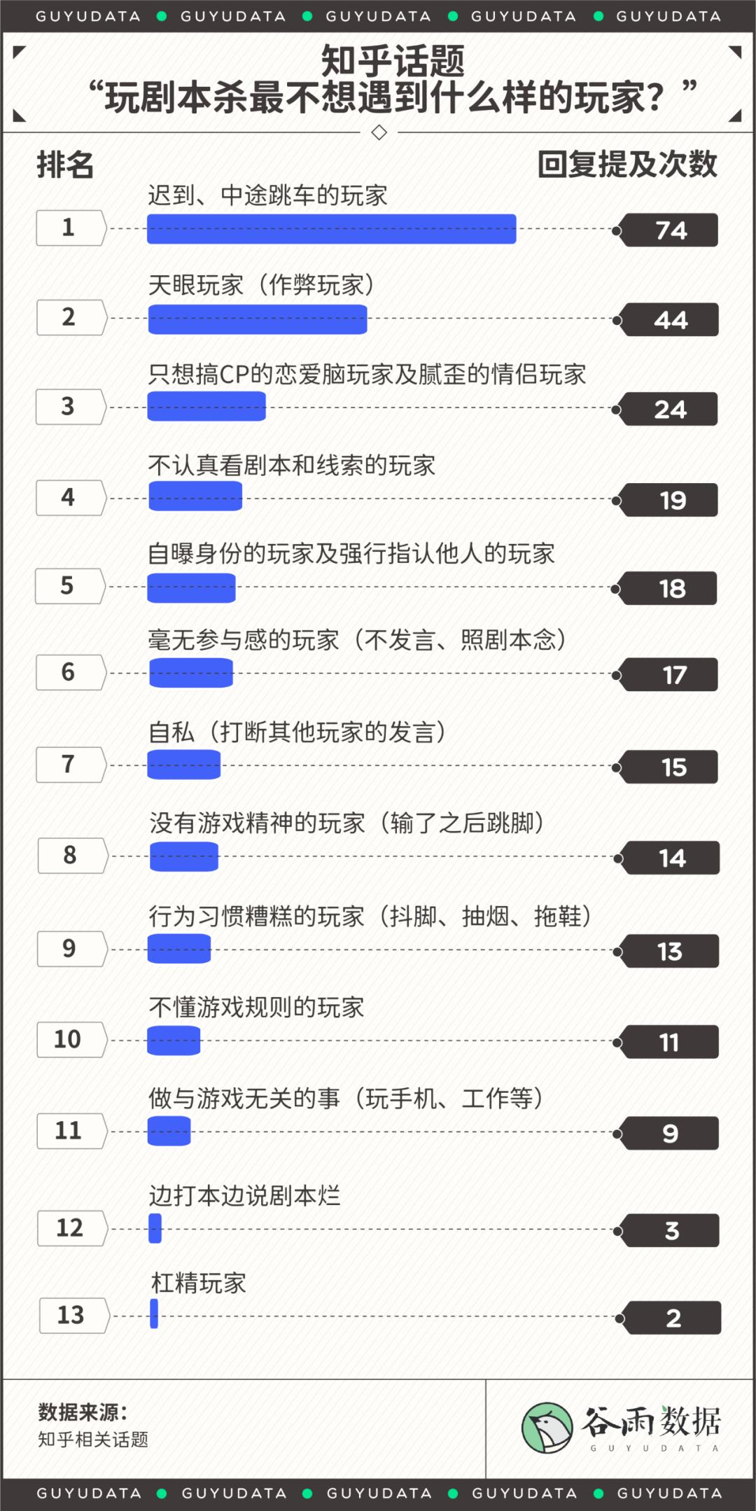 我们统计了知乎话题“大家玩剧本杀最讨厌遇到哪种人”里的129个答案,除了“跳车迟到的玩家”、“天眼玩家(作弊玩家)”之外,玩家们最讨厌的是“只想搞CP的恋爱脑玩家及腻歪的情侣玩家”。