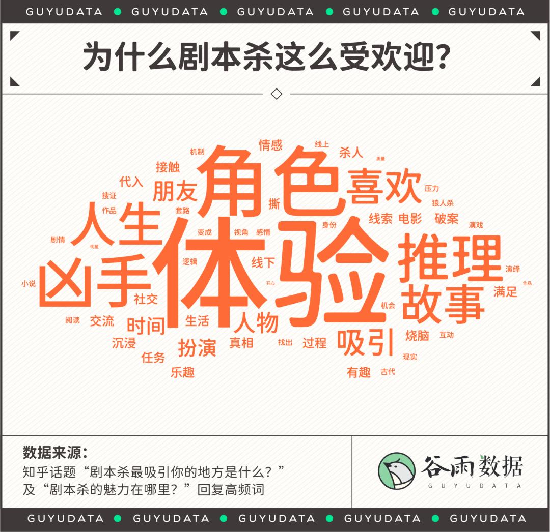 在知乎话题“剧本杀最吸引你的地方是什么”、“剧本杀的魅力在哪里”的回答中,“体验”是被提及最多的词语。