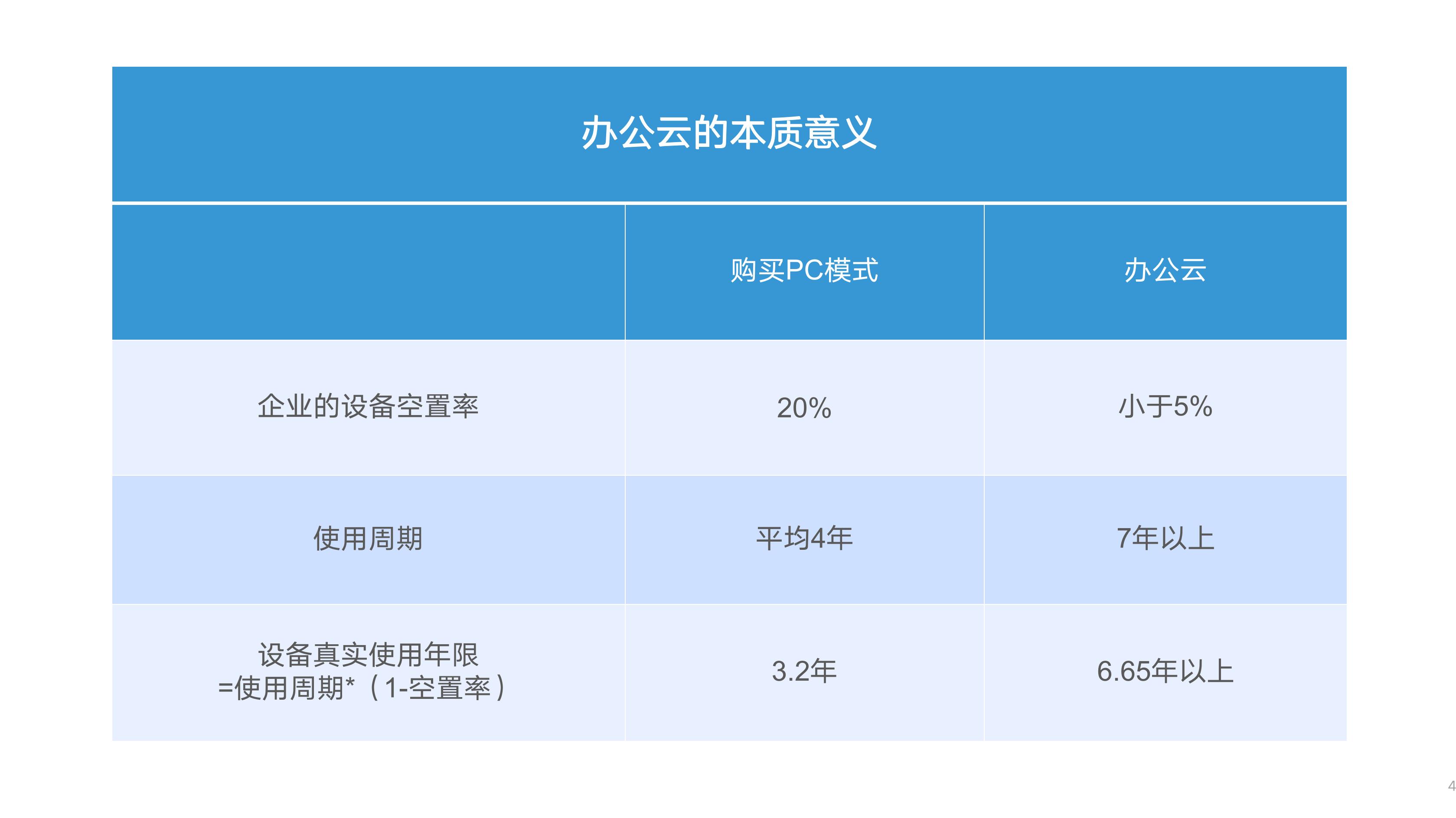 企业设备空置率从20%降至5%以下,使用周期从平均4年提升至7年以上,最终可以计算出所有设备的真实使用年限:购买PC的模式为3.2年,而办公云的数值则能够达到6.65年以上。这意味着设备真实使用年限能够提高一倍以上,客户的使用成本也就有了更大的下降空间。