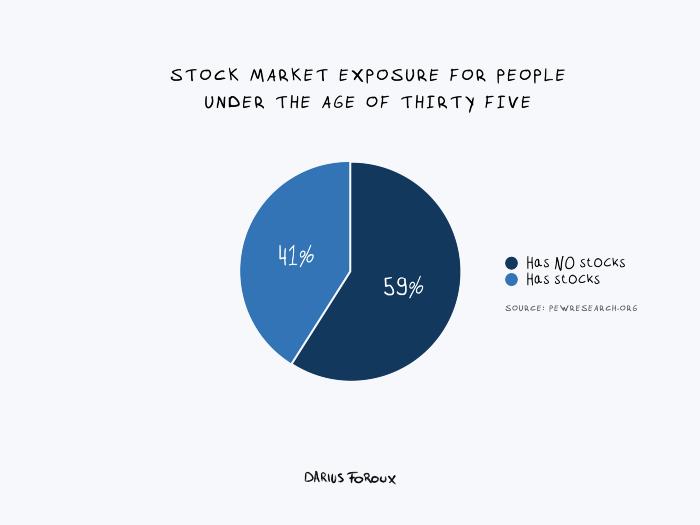 那么,把钱投到标普500指数基金就可以慢慢创造财富,这一点已是大家都知道的事了。但是,在35岁以下的美国人当中,只有41%的人直接或间接投资了股票市场。