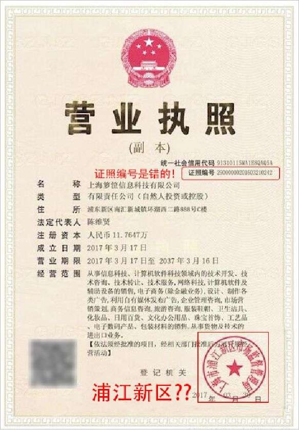 没错,他们确实提供了营业执照,可是这营业执照,仔细一看,就假得很。不仅证照编号是乱写的,盖章信息更是错得离谱,“上海浦江新区”在哪里呢?