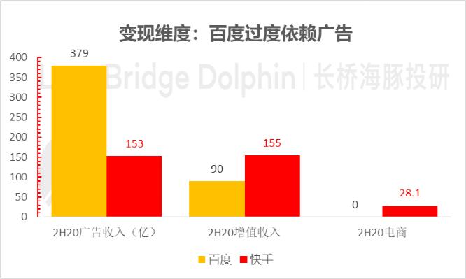 作为变现效率同样较高的信息流广告代表,显然快手和百度代表是两个极端,百度是广告变现的极致状态,而快手则是明显的弱变现状态。