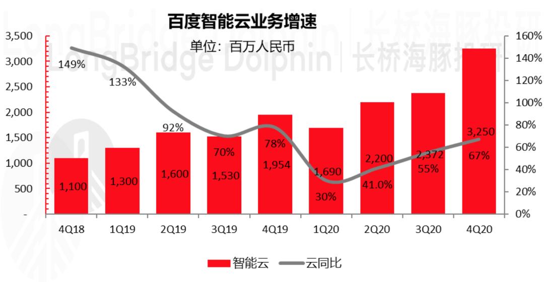 疫情后百度回暖速度较为明显,四季度百度云的收入增速已经达到了67%,但相比同行,如阿里云大体量之上50%+的增长并不算惊艳。