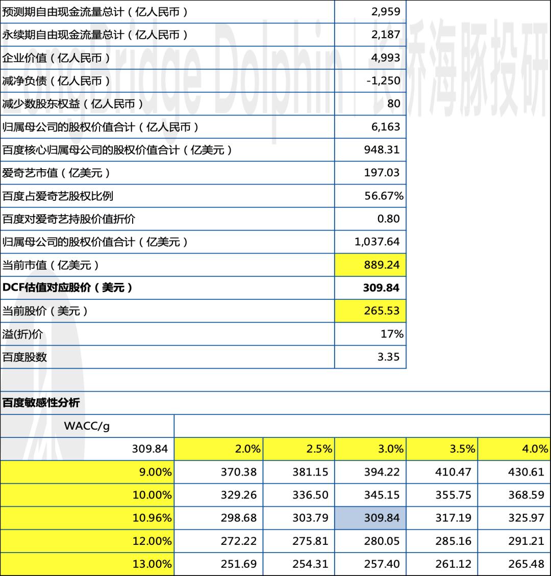 在这种测算方式下,大约意味着百度390美元/股的价值,相当于50%的释放空间。