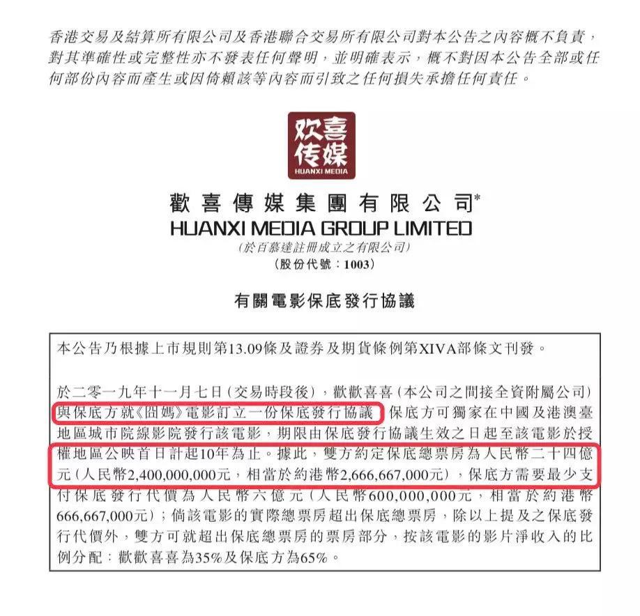 虽然公告并没有对外透露最终的约定保底票房,但通过2019年11月欢喜传媒与横店的《囧妈》保底协议来看,该片也是支付6亿元人民币,保底总票房为24亿人民币。
