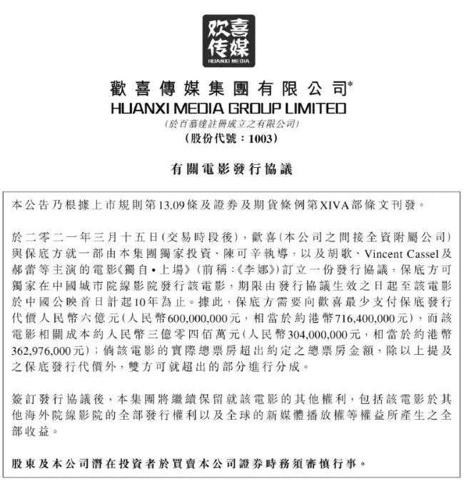 3月15日,欢喜传媒发布公告称,欢喜与保底方华文映像就《独自·上场》(原名:《李娜》)达成一份发行协议,保底方可独家在中国城市院线影院发行该电影。据此,保底方需要向欢喜最少支付保底发行代价人民币6亿元。