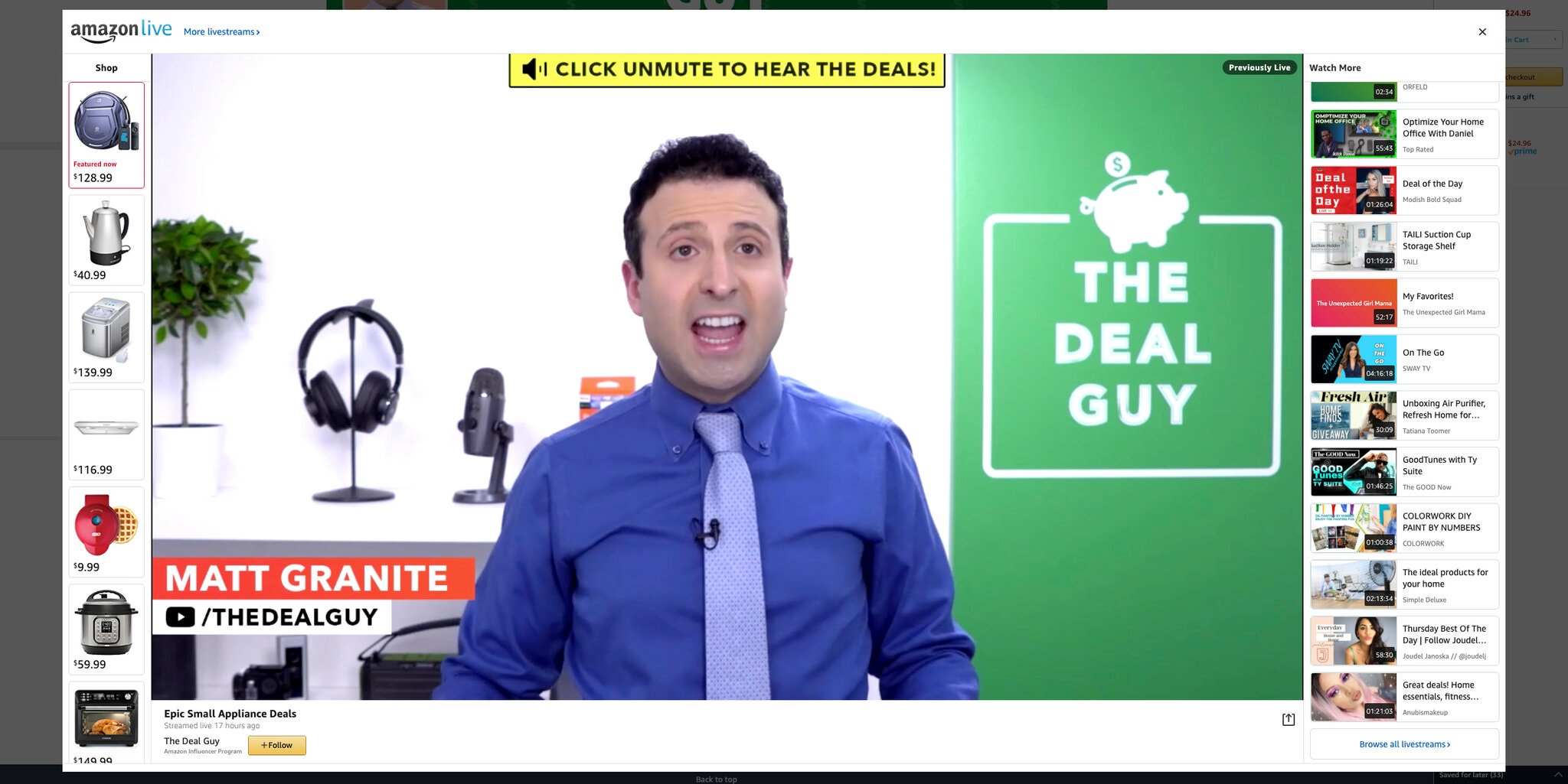 现在,他每天都会在Amazon Live上进行直播,有时候一天要做好几次,卖货的范围涵盖了从厨房杂件到吹雪机的各种物品。每一个视频下放都会对他正在介绍的产品进行轮播展示。当有观众点击并购买该商品时,Granite就能够拿到回扣,佣金比例各不相同,从奢侈品和美容产品的10%到亚马逊生鲜的1%不等。虽然Granite的YouTube频道通过广告和赞助获得的收入更多,但他说自己从Amazon Live视频拿到的收入在过去一年已经有所增长,而观众人数也增加了。