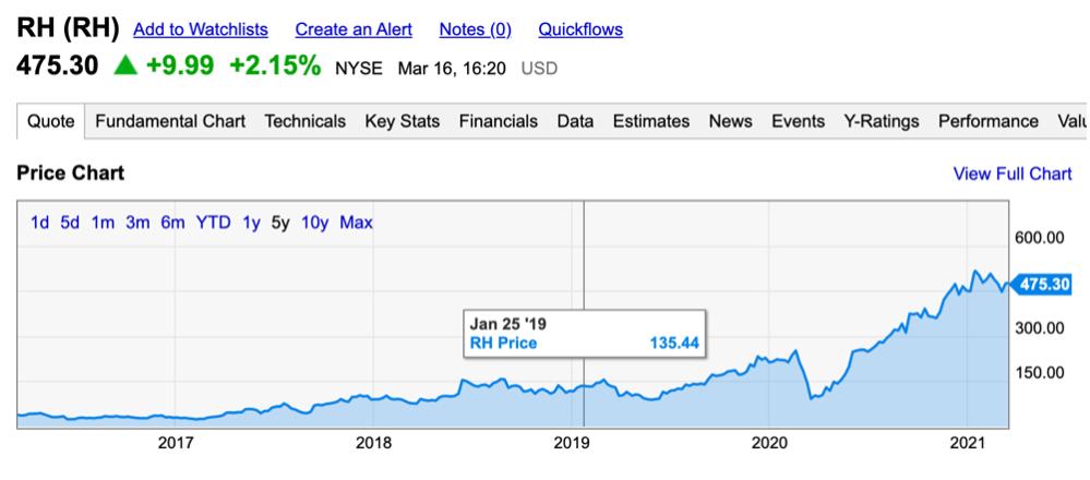 巴菲特建仓RH的消息传出后,个股股价上扬,在2020年2月突破250美元,现如今涨至475美元附近。