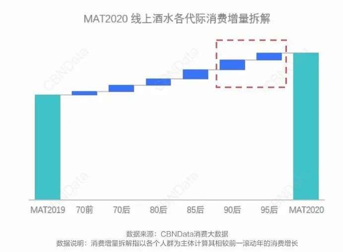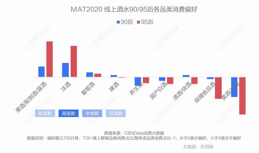 同时,年轻人对「微醺」的追求更乐于购买低度酒。相关报告显示,2020 年线上酒水消费中,95 后对果酒/配料酒/露酒的消费更多。