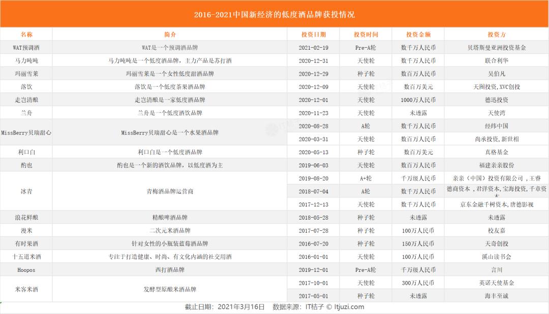 低度酒不仅在消费端受到消费者的喜爱,低度酒品牌也吸引着投资人的目光。IT 桔子数据显示,据不完全统计,2016 年以来有超过 16 个低度酒品牌获得投资。