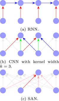 图 | RNN、CNN 和 SAN 分别编码序列的方式