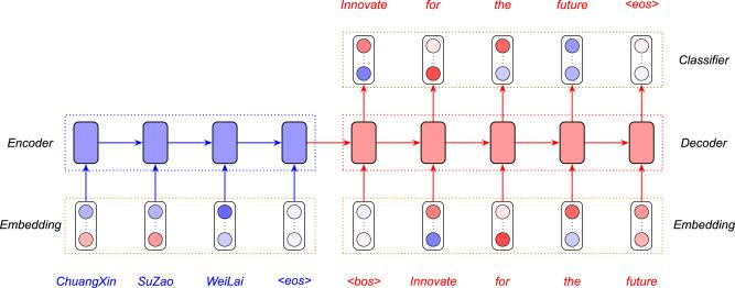 图 | NMT 体系结构示意图,不同颜色代表不同的语言