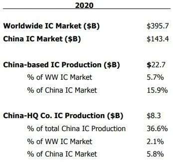 根据研究公司ICInsights的数据,在2020年在中国出售的1,430亿美元芯片中,只有227亿美元在中国生产,而总部位于中国的公司仅生产83亿美元。
