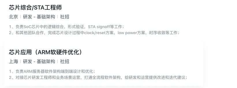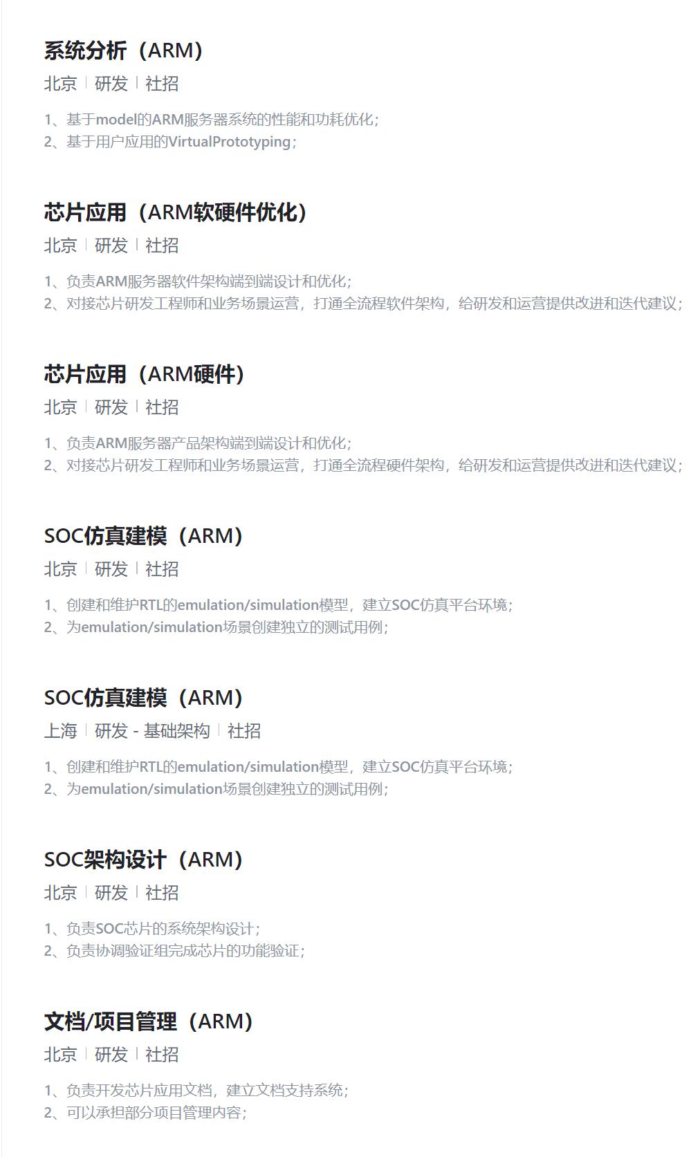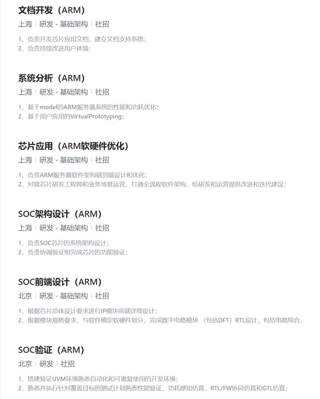 在官网上,这12个职位包括芯片应用(ARM软硬件优化)、芯片应用(ARM硬件,北京/上海)、芯片CAD工程师、芯片综合/STA工程师、芯片DFT工程师、芯片后端设计工程师、芯片CAD等。