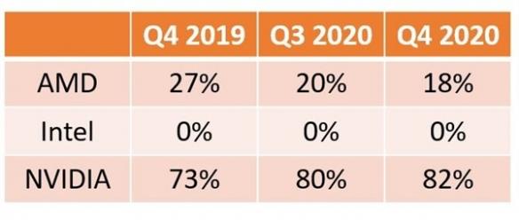 首先,市场上不只英伟达一家显卡供货商,其老对手AMD颇具实力。根据统计机构Jon Peddie Research(JPR)发布的2020年四季度GPU市场的分析报告,在独显市场(单卖显卡),英伟达拿下82%的市场,AMD拿下18%的市场。