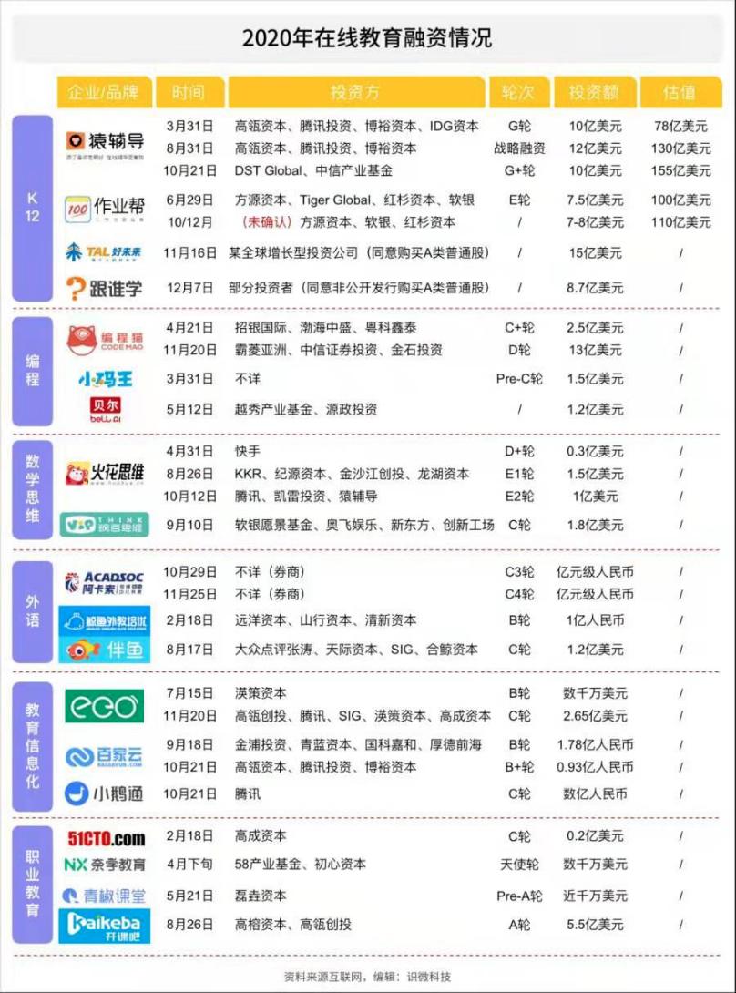 猿辅导去年3月完成10亿美元F轮融资,10月宣布G轮22亿美元,资方均为高瓴资本、腾讯、博裕资本、IDG资本等知名投资机构,如今投后估值已高达155亿美元,成为全球教育科技行业估值最高的独角兽公司。