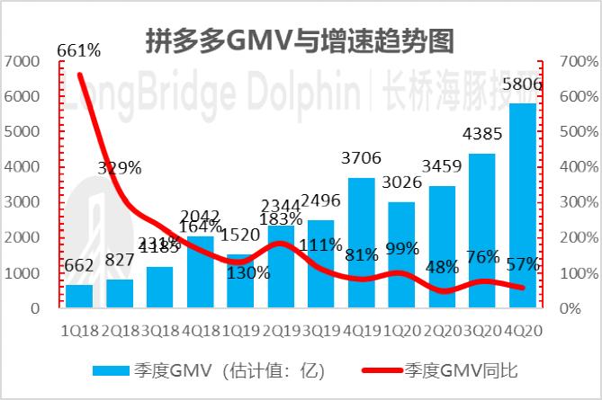 四季度拼多多季度单季GMV大约5806亿,同比增长57%,对比上季度76%增长大幅放缓,也不及此前市场乐观的80%左右的增长预期。