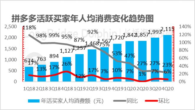 截止2020年,每个活跃买家在拼多多一年的下单金额是2115元,较上个季度的1993元同比增长23%,同比增速较上个季度的27%再次放缓。