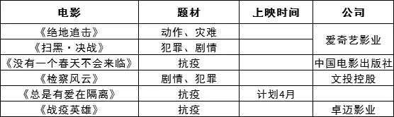 除此以外,还有不少电影公司也先后步入主旋律领域,除了《没有一个春天不会来临》、《总是有爱在隔离》、《战疫英雄》这三部献礼、公益性质的抗疫题材影片外,剩余几部影片大多将选题范围锁定在动作、犯罪类操作难度较低的商业题材。