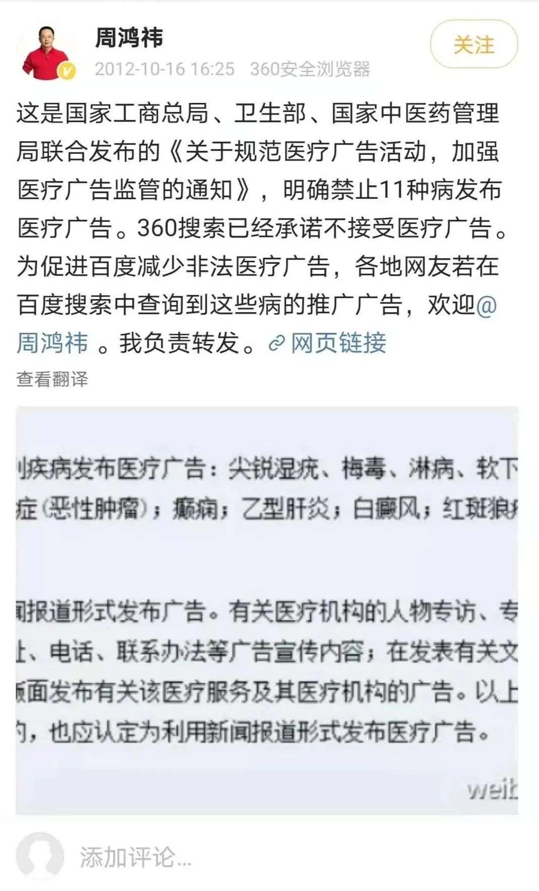 2012年9月,周鸿祎说:“有些钱,我们反正下决心坚决不赚,特别是那些混在搜索结果中的虚假医疗广告,害了多少想用搜索求医问药的弱势群体。”