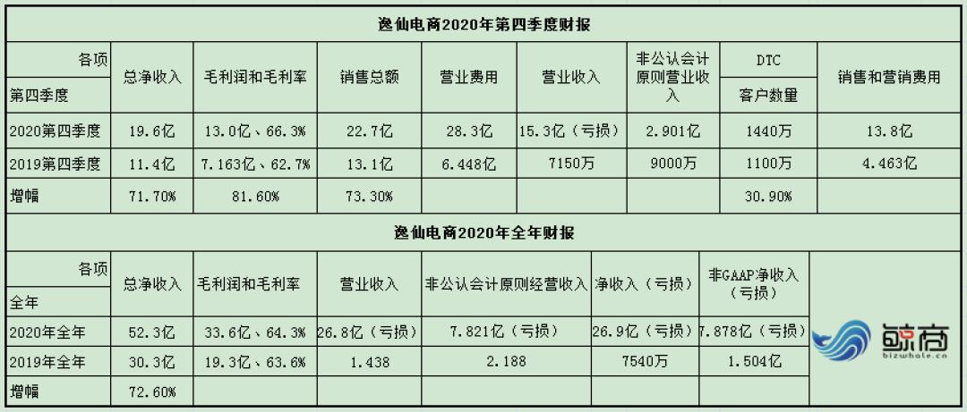 亏损以外被忽视的是,2020年第四季度和全年的增长数据。逸仙电商全年的总净收入增长到52.3亿元,同比增长了72.6%,第四季度贡献了19.6亿元。